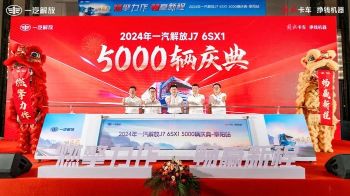 Half of the journey in 2024, the sales of Liberation J7 6SX1 exceeded 5000, creating a new brilliant record. At the ceremony, Zhang Jiwei, General Manager of the Heavy duty Vehicle Sales Company of FAW Jiefang Headquarters, Zhang Nan, General Manager of Yukuai Chuangling Intelligent Technology (Nanjing) Co., Ltd., Ji Jian, Marketing Department Director of FAW Jiefang Powertrain Division, Zhang Sijun, Manager of FAW Jiefang Anhui Region Department, and Sun Yan, Investor of Fuyang Yiqi Xinye Automobile Trading Co., Ltd., jointly took the stage to open the "5000 car celebration". The sales breakthrough of J7 6SX is not only the trust of users in Jiefang, but also the supreme honor and highest recognition given by the times to Jiefang J7 6SX1.