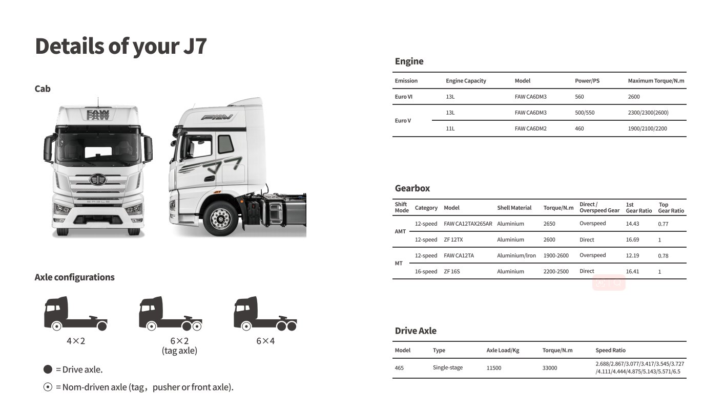 FAW J7 6X4 Tractor Truck ,more than the best,Best generation than ever. Best performance in all aspects . As a landmark work of China's heavy-duty truck to the world. J7 never stops moving forward. Well-known for its fuel efficiency, light weight and low maintenance cost, forging a high cost performance truck with high efficiency, reliability, safely and comfort ability.