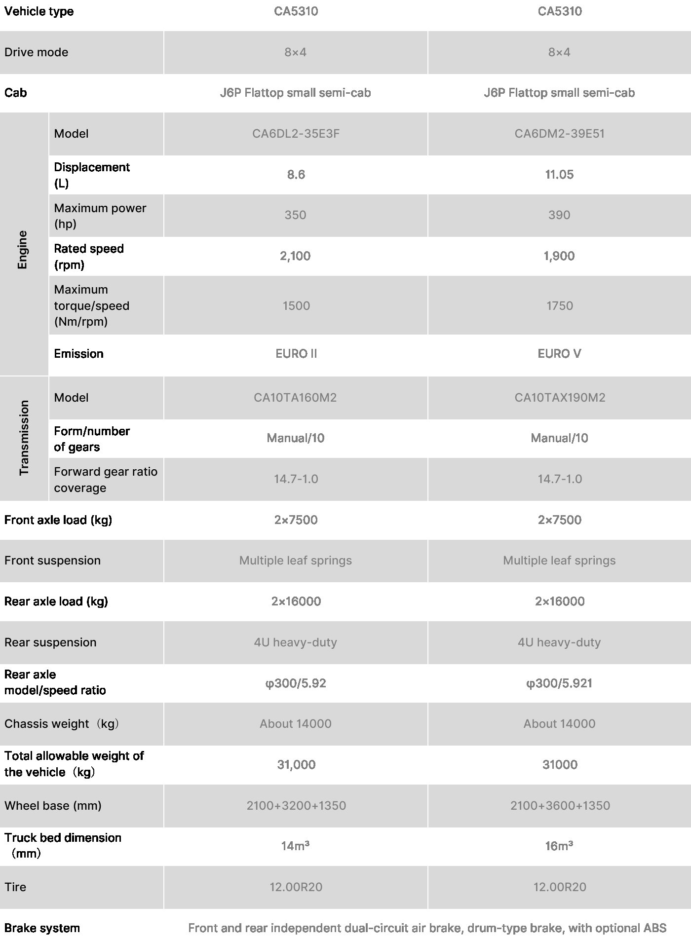 FAW TRUCKS J6P SERIES MODEL 8X4 is well-known for its outstanding fuel-economy (can save fuel by 2-3 liters per hundred kms), spacious cab, big power engine of 11 liters, it is a safe, reliable and comfortable money-making machine for users.