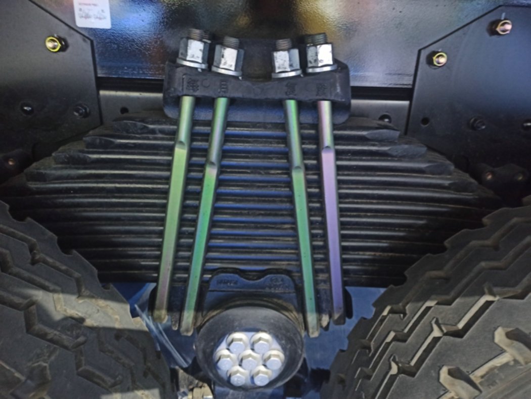 The rated load of the front axle is 9 tons, the rated load of the rear axle is 16 tons ×2, and the speed ratio of the main reducer is 5.921. In terms of suspension, the front suspension and rear suspension of the car adopt the form of multiple springs, and the number of steel plate springs is 12. In terms of braking, the service brake of the vehicle is drum brake, the front brake is drum brake, the rear brake is drum brake, the parking brake is compressed air controlled spring energy storage parking brake system, and the auxiliary brake is engine exhaust brake. The vehicle voltage is 150Ah battery, and the fuel tank is 400 liters steel tank.